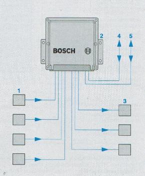 Рис.4. Системные блоки электронного управления работой дизеля 1. Датчики и задающие устройства (входные сигналы) 2. Электронный блок управления 3. Исполнительные механизмы 4. Взаимодействие с другими системами дизеля 5. Диагностика