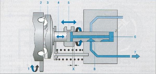 Рис. 2. Принцип действия распределительного ТНВД с аксиальным движением плунжера и распределения топлива с помощью регулирующей кромки 1. Траектория поворотов роликового кольца 2. Ролик 3. Кулачковая шайба 4. Аксиальный плунжер-распределитель 5. Регулирующая втулка 6. Камера высокого давления 7. Подача топлива к форсунке 8. Распределительный паз X- активный ход плунжера Кулачковая шайба 3 (Рис.2), жестко соединенная с плунжером-распределителем 4, приводится во вращение от двигателя. Число кулачков, выполненных в виде выступов на рабочей поверхности шайбы, соответствует числу цилиндров двигателя. Шайба обкатывается по роликам 2, при наезде на которые кулачки приводят вращающий плунжер –распределитель в дополнительное возвратно- поступательное движение. По мере вращения приводного вала плунжер- распределитель совершает столько ходов, сколько требуется по числу цилиндров двигателя. При этом топливоподкачивающий насос нагнетает топливо в камеру 6 высокого давления, которое создается плунжером- распределителем. Вращаясь он открывает и закрывает распределительные отверстия, направляя топливо через распределительный паз 8 к отдельным форсункам. Продолжительность впрыскивания и цикловая подача изменяются путем перемещения регулирующей втулки 5, которая управляется механическим регулятором. Роторные ТНВД или ТНВД с радиальным движением плунжеров (Рис.3) также снабжен кулачковой шайбой 3, только в отличие от распределительных насосов с аксиальным движением плунжера она имеет кольцевую форму. Кроме того, роторные ТНВД имеют от двух до четырех радиальных плунжеров 4, создающих высокое давление топлива. Данные ТНВД могут создавать более высокое давление топлива, чем аксиальные ТНВД.