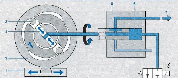 Электромагнитный поворотный исполнительный механизм 2 (Рис.7) действует через валик на регулирующую втулку. Управляющий канал в зависимости от режима работы ТНВД может открываться раньше или позже. Величина цикловой подачи постоянно изменяется в пределах между нулевым и максимальным значениями (например, при холодном пуске). Управление изменением этой величины происходит в зависимости от ширины сигналов ШИМ. В обесточенном состоянии возвратные пружины исполнительного механизма переводят его в «нулевое» положение. Угол поворота исполнительного механизма, и, следовательно, положения регулирующей втулки определяется датчиком 1. Его сигналы и частота вращения определяет необходимую цикловую подачу. Давление внутри ТНВД, пропорциональное частоте вращения, действует на поршень установки момента начала подачи и регулируется электромагнитным клапаном5, который также управляется импульсными сигналами. При длительно открытом электромагнитном клапане, когда давление понижается, устанавливается более поздний момент подачи, а при закрытом клапане (повышение давления) более ранний.