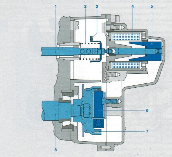 Рис.6. Исполнительный механизм электронного регулятора частоты вращения рядного ТНВД 1. Рейка ТНВД 2. Возвратная пружина 3. Контактное кольцо датчика пути регулирования 4. Электромагнит 5. Якорь электромагнита 6. Датчик частоты вращения 7. Импульсное кольцо датчика частоты вращения 8. Кулачковый вал ТНВД