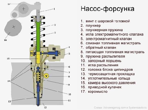Насос-форсунка объединяет в одну конструкцию топливный насос высокого давления (ТНВД) и форсунку, которая встроена в головку блока непосредственно над каждым цилиндром. В этом случае магистраль высокого давления отсутствует, что позволяет обеспечить очень высокое давление впрыскивания, что в свою очередь, способствует повышению мощности дизеля, уменьшению расхода топлива и снижению уровня отработанных газов (ОГ).