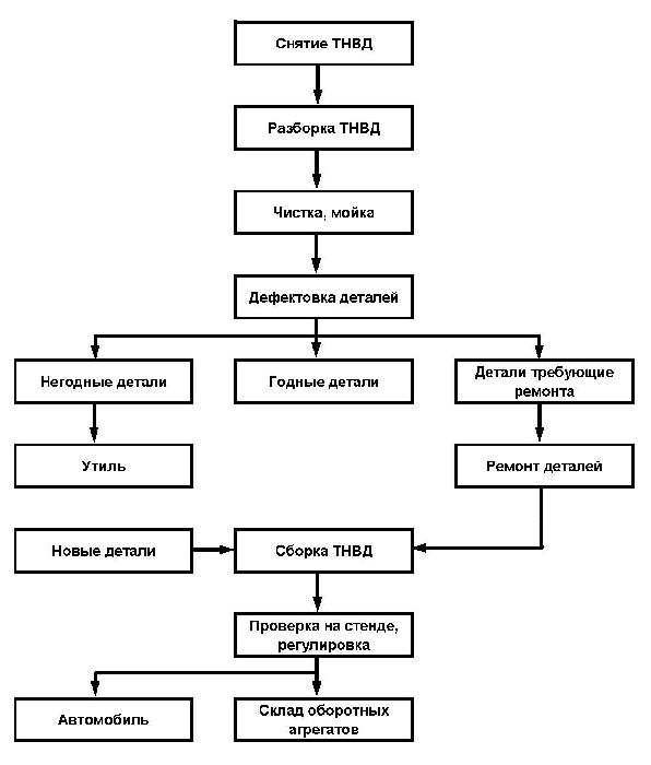 Методы ремонта могут сильно различаться для каждых типов ТНВД, ввиду большого разнообразия их конструкций. Однако общая технология ремонта производится по следующей схеме: