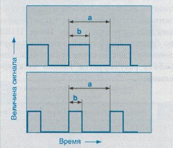 ЭБУ обрабатывает сигналы датчиков и задающих устройств по определенным программам и алгоритмам управления. Он управляет исполнительными механизмами с помощью электрических выходных сигналов. ЭБУ способен обрабатывать входные сигналы от датчиков в аналоговой, цифровой и импульсной формах, ограничивать их допустимыми напряжениями и проводить проверку на достоверность. ЭБУ рассчитывает момент начала и продолжительность впрыска топлива, учитывая параметры загруженных в него характеристик и сигналы датчиков. Затем расчетные величины преобразуются в выходные сигналы, которые генерируются в виде сигналов широтно-импульсной модуляции (ШИМ), при помощи которых исполнительные механизмы приводятся в любое рабочее положение. Рис.5 иллюстрирует принцип работы исполнительного механизма (ИМ) на основе ШИМ. Сигналы постоянной частоты с варьируемым временем включения имеют прямоугольную форму. Сила тока при подаче сигналов всегда постоянна. Эффективная же сила тока, влияющая на работу якоря ИМ, зависит от соотношения включенного и выключенного состояния электромагнита ИМ. Малое время включения создает меньшую эффективную силу тока, а большее время - большую.
