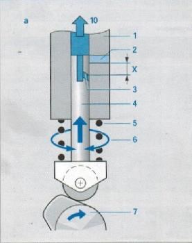 Рис. 1. Принцип работы рядного ТНВД a – стандартный рядный ТНВД типа PE 1. Гильза плунжера 2. Впускное окно 3. Регулирующая кромка плунжера 4. Плунжер 5. Возвратная пружина плунжера 6. Траектория поворотов плунжера вокруг своей оси (установка цикловой подачи) 7. Кулачковый вал привода плунжеров 10. Подача топлива к форсунке X- активный ход плунжера