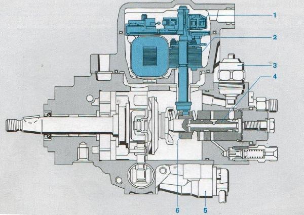 Рис. 7. Электромагнитный исполнительный механизм распределительного ТНВД с ЭБУ 1. Полудифференциальный коротко-замкнутый кольцевой датчик 2. Электромагнитный поворотный исполнительный механизм регулировки цикловой подачи 3. Электромагнитный остановочный клапан 4. Плунжер-распределитель 5. Электромагнитный клапан регулирования момента начала подачи 6. Регулирующая втулка