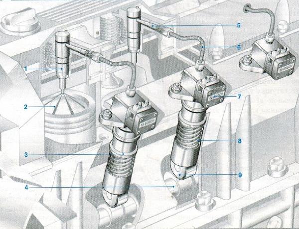 Рис. 8. Схема расположения индивидуальных ТНВД с ЭБУ на двигателе 1. Ступенчатый корпус форсунки 2. Камера сгорания двигателя 3. Индивидуальный ТНВД 4. Распределительный вал двигателя 5. Штуцер магистрали высокого давления 6. Магистраль высокого давления 7. Электромагнитный клапан 8. Возвратная пружина 9. Роликовый толкатель
