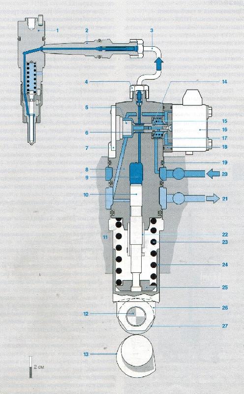 Рис. 9. Конструкция индивидуального ТНВД с электромагнитным клапаном 1. Ступенчатый корпус форсунки 2. Штуцер магистрали высокого давления 3. Магистраль высокого давления 4. Накидная гайка ТНВД 5. Ограничитель хода иглы электромагнитного клапана 6. Игла электромагнитного клапана 7. Пластина 8. Корпус ТНВД 9. Камера высокого давления (в плунжерной паре) 10. Плунжер 11. Блок цилиндров дизеля 12. Ось роликового толкателя 13. Кулачок 14. Тарелка пружины 15. Пружина клапана 16. Корпус клапана с катушкой и магнитным сердечником 17. Пластина якоря 18. Проставка 19. Уплотнение 20. Канал подвода топлива (низкое давление) 21. Канал обратного слива топлива 22. Ловушка для возврата просачивающегося вокруг плунжера топлива 23. Пружина толкателя 24. Стакан толкателя 25. Тарелка пружины 26. Роликовый толкатель 27. Ролик толкателя