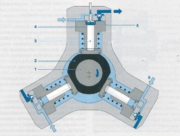 Рис. 10. ТНВД системы Common Rail 1. Вал привода 2. Эксцентриковый кулачок 3. Плунжер с втулкой 4. Впускной клапан 5. Выпускной клапан 6. Подача топлива