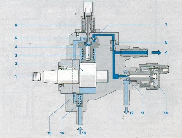 Рис. 11. Схема продольного разреза ТНВД системы Common Rail 1. Вал привода 2. Эксцентриковый кулачок 3. Плунжер с гильзой 4. Камера над плунжером 5. Впускной клапан 6. Электромагнитный клапан отключения плунжерной секции 7. Выпускной клапан 8. Уплотнение 9. Штуцер магистрали, ведущей к аккумулятору высокого давления 10. Клапан регулирования давления 11. Шариковый клапан 12. Магистраль обратного слива топлива 13. Магистраль подачи топлива к ТНВД 14. Защитный клапан с дроссельным отверстием 15. Перепускной канал низкого давления Когда величина давления опускается ниже давления, создаваемого топливоподкачивающим насосом, впускной клапан 5 открывается и процесс повторяется.